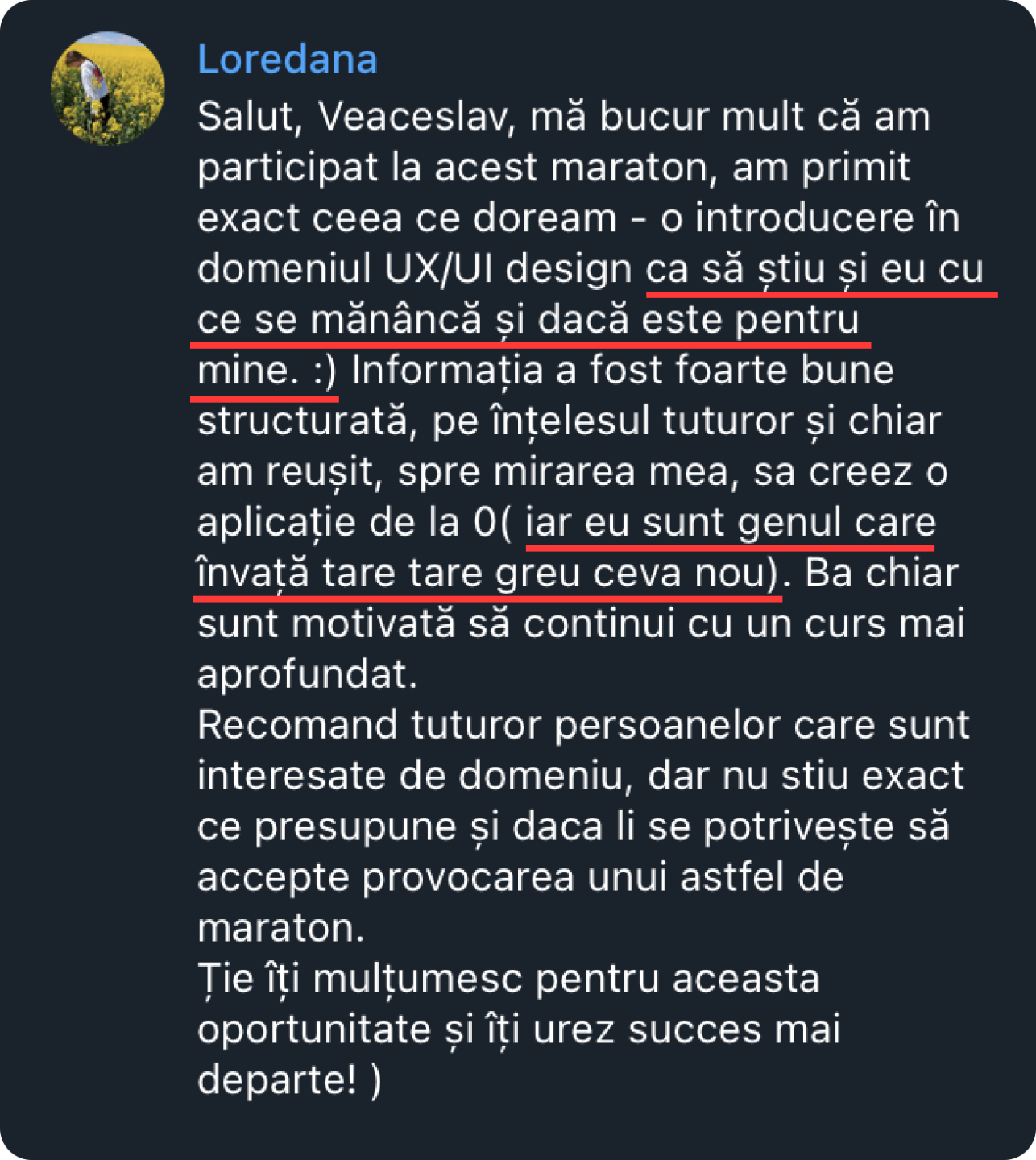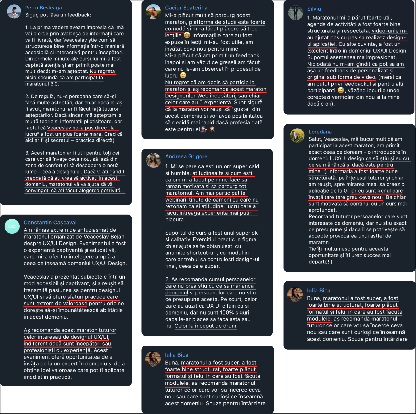 Vei avea un chat privat cu Mentorul pentru suport și ghidare. Fiecare temă va fi verificată individual de către Mentor pe toată durata cursului.